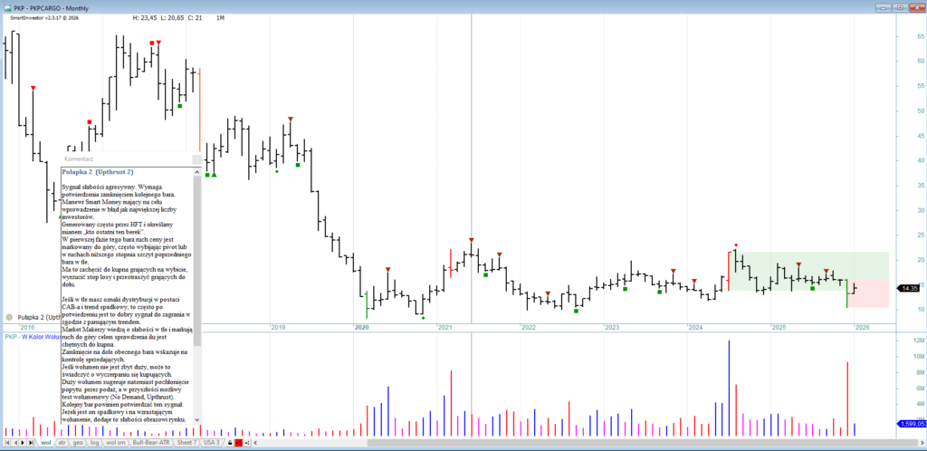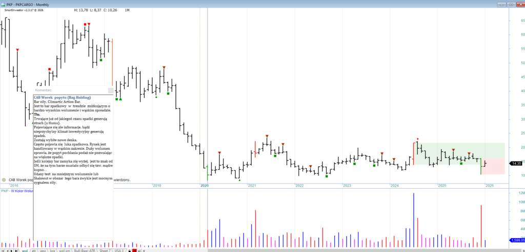 - Interwał miesięczny: Bag Holding, granice TR, testy podaży/popytu