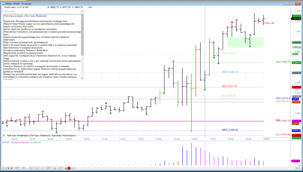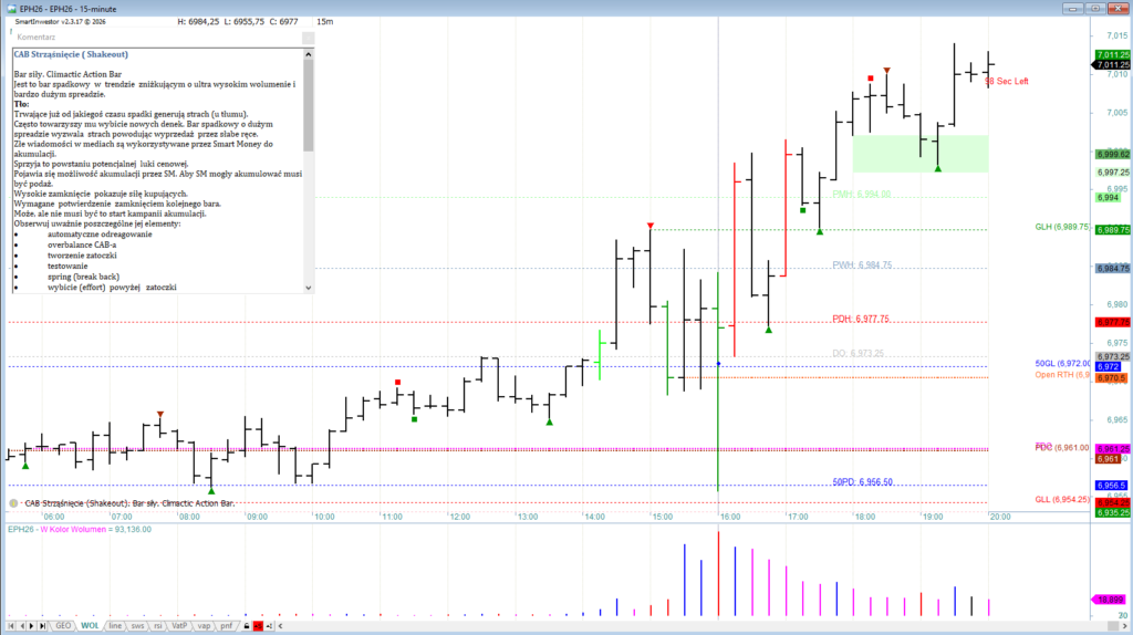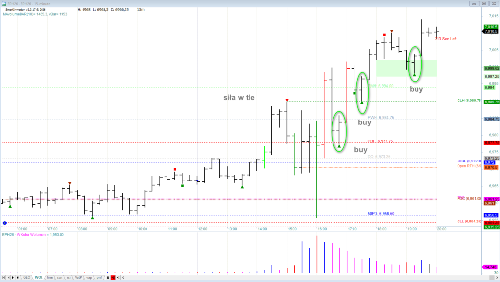 • Sygnały wolumenowe na wykresach – czerwone i zielone strefy pokazujące, gdzie się kumuluje presja kupujących i sprzedających