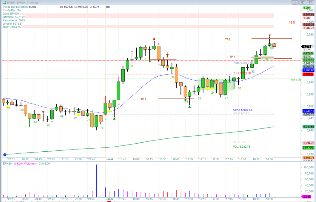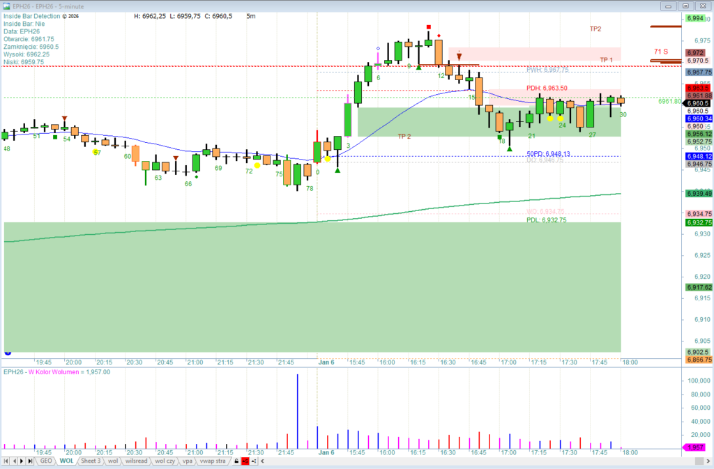 - ✅ Wpisanie w pozycję: 2 mini kontrakty na poziomie 6961 (Trading Range)