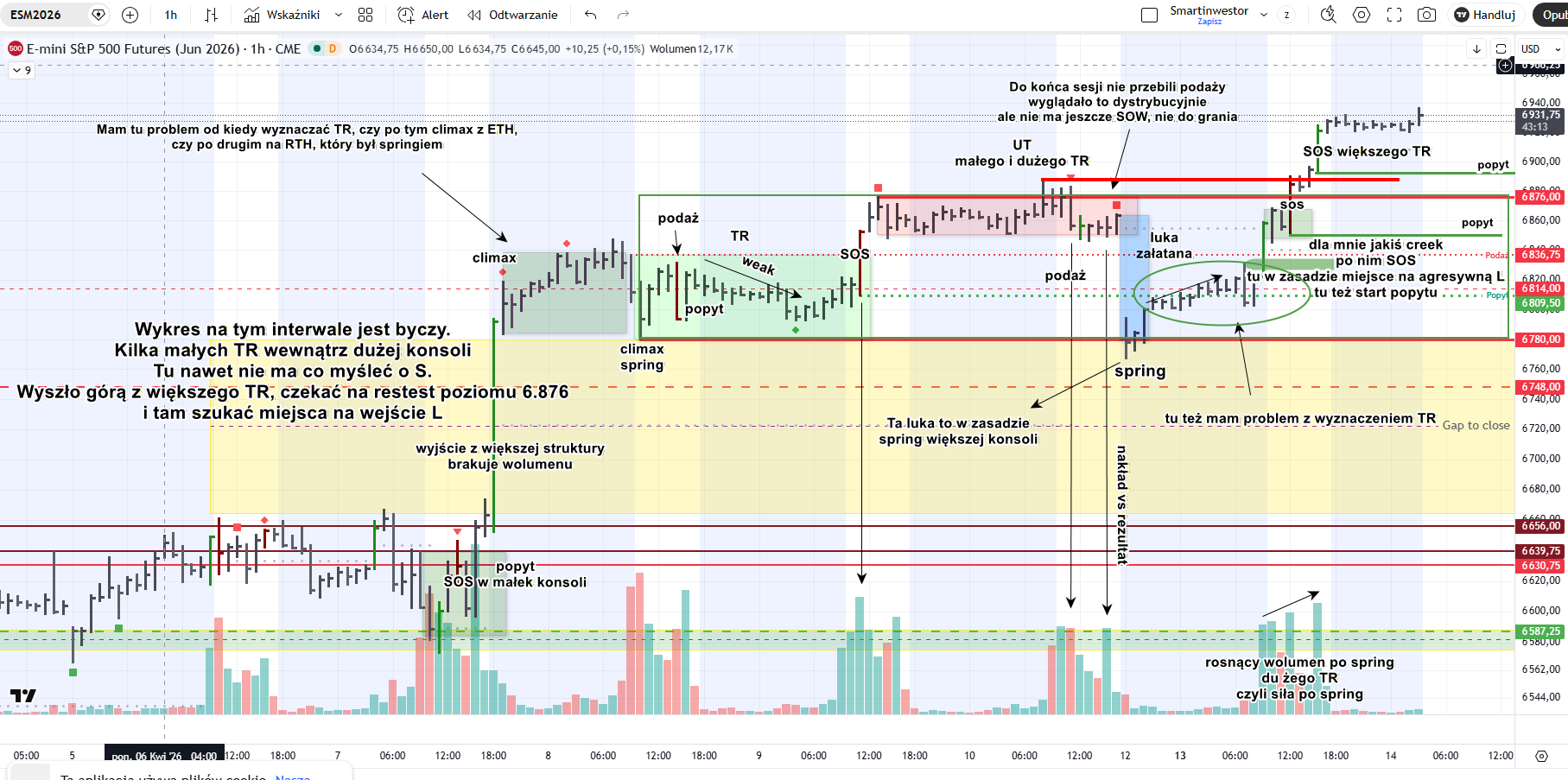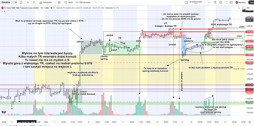 Na przykładzie wykresu ESM2026 z interwału 1h widać, że codzienna analiza wykresu może dawać bardzo konkretny obraz sytuacji. Pojawiają się tam takie elementy jak TR, spring, SOS, popyt czy strefy, w których rynek reaguje na wcześniejszy ruch.